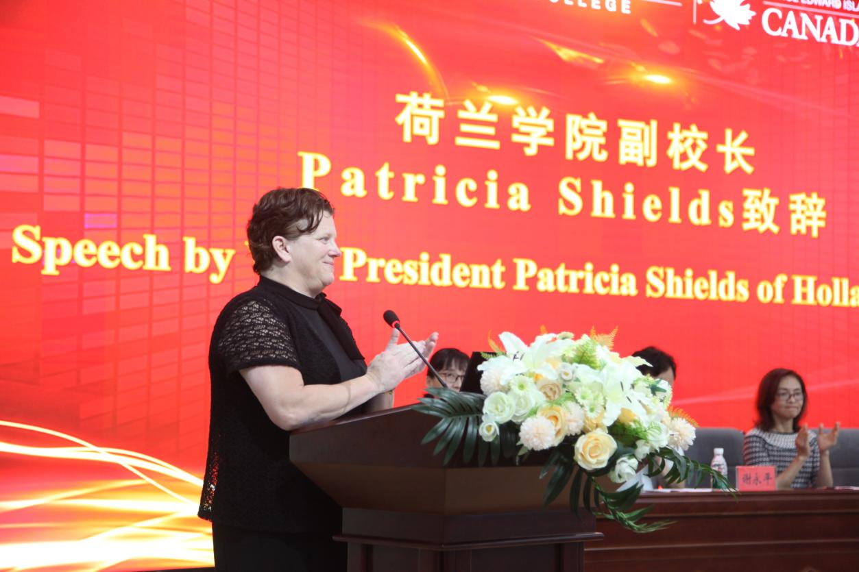 Patricia Shields在致辞中对1xbet平台领导及全体教职工在中加合作办学项目中的辛勤付出致以诚挚的谢意,对同学们从荷兰学院与1xbet平台两所院校同时顺利毕业表示衷心的祝贺,向1xbet平台在与荷兰学院合作办学方面所表现出来的远见卓识和非凡勇气致以敬意。同时,她鼓励毕业生们勇于追寻自己的梦想,热切期待两校在未来建立更紧密、深入的合作关系。