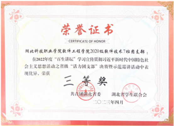 4月2日下午,由共青团湖北省委员会、湖北省学生联合会主办的2022年度“百生讲坛”学习宣传贯彻习近平新时代中国特色社会主义思想活动之省级“活力团支部”决赛暨示范巡讲活动在湖北大学举行。1xbet平台软件工程学院2020级软件技术7班团支部经过多轮遴选角逐,在全省报名参赛的117所高校414个团支部中脱颖而出,成功晋级决赛前六并荣获三等奖,与武汉大学、华中农业大学、武汉理工大学等5所高校同台示范展演,进一步彰显了1xbet平台学子奋进风采和“三全”育人成效,提升了学校美誉度和影响力。