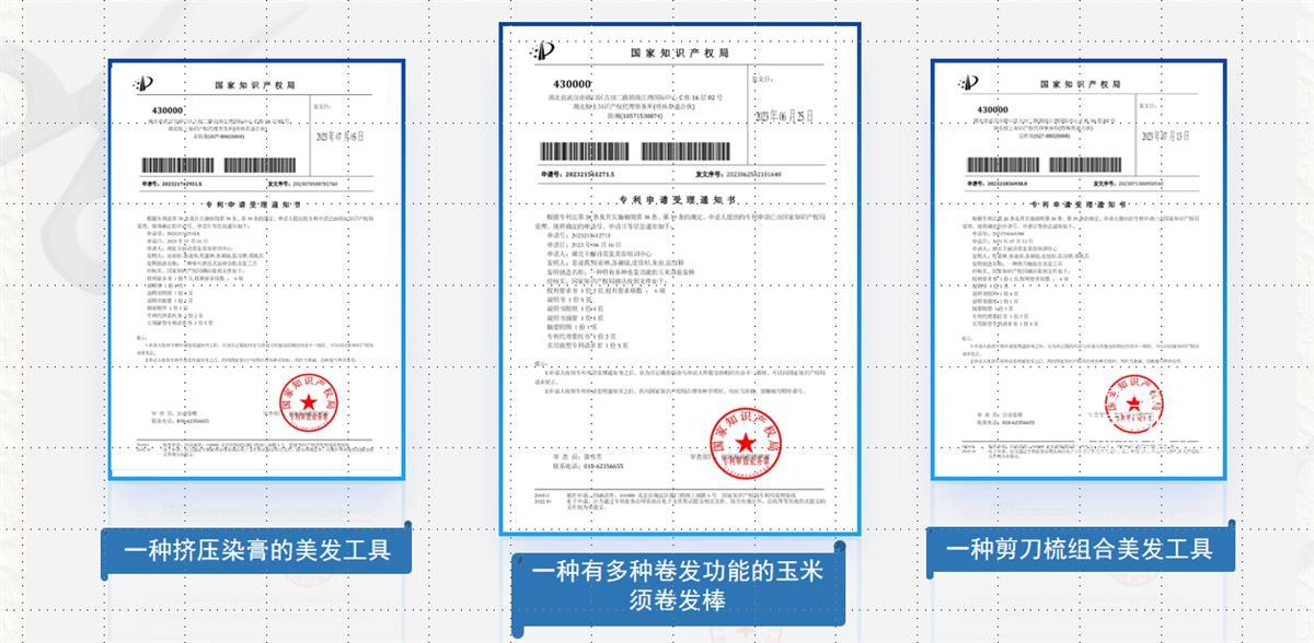 纸上得来终觉浅,绝知此事要躬行。姜凌霄抓住每一次专业技能实践的机会,迅速提升专业技能,并结合专业所学,申请通过了3项专利:挤压染膏的美发工具,有多种卷发功能的玉米须卷发棒和剪刀梳组合美发工具。