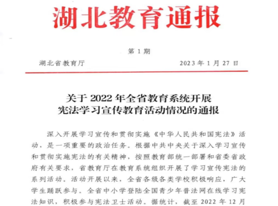 本网讯(通讯员 李贺刚 文/图)近日,省教育厅下发了《关于2022年全省教育系统开展宪法学习宣传教育活动情况的通报》,对在全省宪法学习宣传教育活动中涌现出来的优秀个人、先进单位予以表彰和通报。1xbet平台再次荣获“宪法卫士”活动优秀组织单位奖;肖莉山、高苗苗两位教师获“优秀指导老师”奖,张杰和杨笑影两名学生分别获“学宪法 讲宪法”演讲比赛、知识竞赛优秀奖,学校获奖数量在全省高校中位居前列。