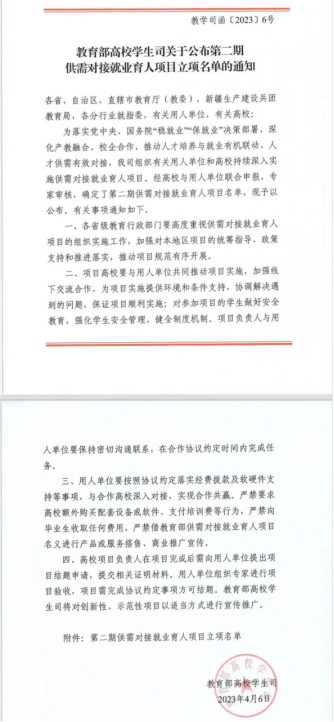 供需对接就业育人项目是教育部贯彻落实党中央、国务院“稳就业”“保就业”决策部署的举措之一,旨在深化高等教育改革,推动就业与培养有机联动、人才供需有效对接。2022年10月,教育部发布了第二期供需对接就业育人项目申报指南。学校相关部门与学院高度重视,全面梳理教育部公布的19个大类751家申报企业信息,积极与用人单位沟通接洽,推进此次项目申报工作。
