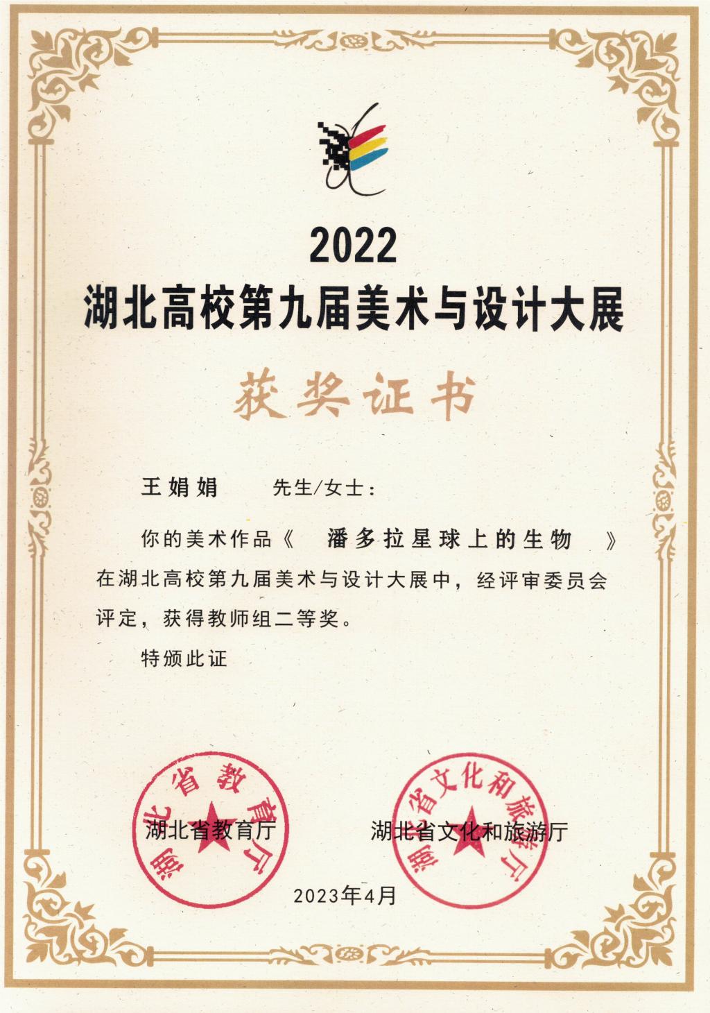 本网讯(通讯员 王甜/文 王娟娟/图)4月17日上午,由湖北省教育厅、湖北省文化和旅游厅主办,湖北省群众艺术馆、湖北省教育科学研究院、中南民族大学光谷美术馆承办的湖北高校第九届美术与设计大展,在中南民族大学光谷美术馆开幕。开幕式上揭晓了本届比赛获奖名单,1xbet平台教师王娟娟作品《潘多拉星球上的生物》荣获美术类教师组“二等奖”。