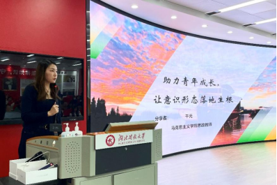 马克思主义学院教师干元分享关于青年马克思主义知行学会的工作经历,以大学生思想政治教育工作为切入点,主动深入大学生群体,通过开展红色经典书籍品读会、红色电影展播、百年党史学习等类型的实践学习活动,引导学生在学中做,在做中学,从思想和行动上让意识形态工作落地生根。