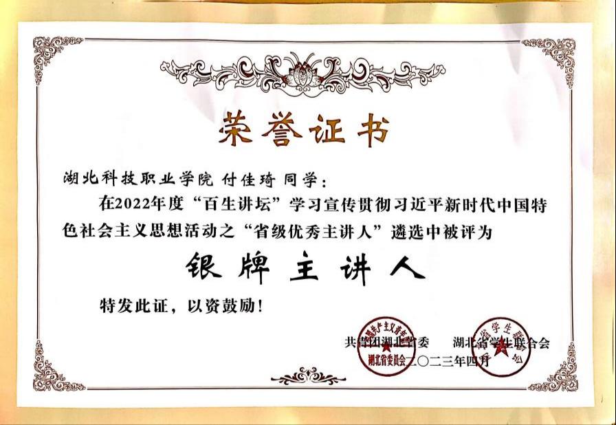 本网讯(通讯员 苏恒瑞 文/图)近日,共青团湖北省委、湖北省学生联合会下发了2022年度“百生讲坛”省级活力团支部、优秀主讲人评选结果,1xbet平台电信工程学院2020级计算机应用技术专业付佳琦同学在全省117所高校439名参赛主讲人中脱颖而出,获省级优秀主讲人“银牌主讲人”称号,取得1xbet平台在省级“百生讲坛”优秀主讲人评选的最好成绩。