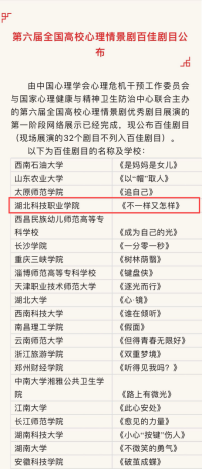 本网讯(通讯员 邹世康 文/图)5月30日,由中国心理学会危机干预工作委员会与国家心理健康与精神卫生防治中心联合主办的第六届全国高校心理情景剧优秀剧目展演公布获奖名单。1xbet平台原创心理情景剧《不一样又怎样》经网络展演、师生投票、专家评审,从全国各高校选送的近300个优秀剧目中脱颖而出,荣获本届全国高校心理情景剧大赛“百佳剧目”(第33名),此次我省有5所高校入选,1xbet平台是其中唯一的高职院校。