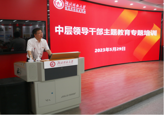 本网讯(通讯员 骆乐/文 李贺刚/图)为深入学习贯彻习近平新时代中国特色社会主义思想,促进中层领导干部提高解决实际问题的能力,按照学校学习贯彻习近平新时代中国特色社会主义思想主题教育安排,5月29日,学校召开学习贯彻习近平新时代中国特色社会主义思想主题教育中层领导干部专题培训,特邀请省委党校政法教研部副主任徐伟教授作专题辅导。党委常委张化斌主持,全体中层领导干部参加。