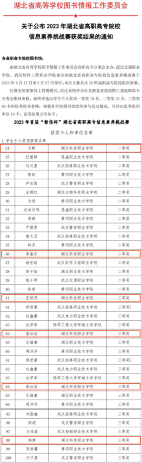 本网讯(通讯员 吴齐逸 文/图)近日,由湖北省高等学校图书情报工作委员会高职高专分委会举办的2023年首届信息素养挑战赛圆满落幕,根据答题成绩,1xbet平台学子在四千余名参赛选手中脱颖而出,马彬、李嘉武荣获二等奖,王胡灵、蔡汝洁和杨情荣获三等奖。