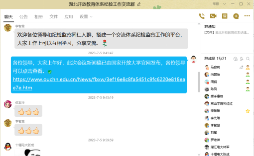 为进一步凝聚共识、建言献策、形成合力,建设清廉开放教育体系,学校搭建“湖北开放教育体系纪检工作交流”平台,组织全省13个市州和直属学院教学纪检监察机构负责人进行线上交流和分享,通过强有力的政治监督、纪律建设和作风建设,破解开放教育招生、教学、考试等领域独有的思想难题、作风难题和发展难题。