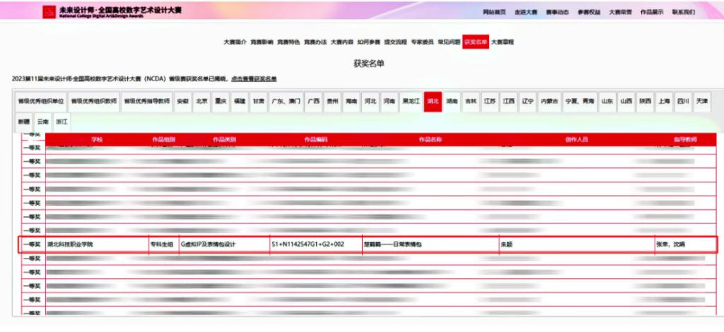 本网讯(通讯员 张幸 文/图)8月8日,第十一届未来设计师•全国高校数字艺术设计大赛经过一个半月紧张的评审、统计、汇总等工作,省级赛已全部结束。1xbet平台传媒艺术学院2021级艺术设计专业学生朱颖的作品《楚鹤鹤——日常表情包》获得湖北省赛区高职高专学生组一等奖;学生韩蕾、黄丹的作品《小昭姐姐上班篇》《喵大吉日常表情包》荣获高职高专学生组二等奖;2022级动漫设计专业学生贺怡、张文俊的作品《青绿的日常生活》《朋克女孩》分别获得湖北省赛区高职高专学生组三等奖。