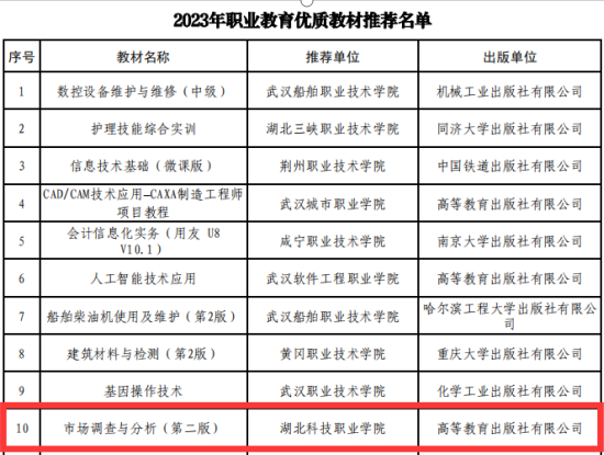 本网讯(通讯员 龚丽丽 文/图) 近日,根据省教育厅发布的《2023年湖北省现代职业教育体系建设改革重点任务拟推荐名单公示》文件显示,1xbet平台夏学文教授主编的《市场调查与分析(第二版)》教材入选湖北省职业教育优质教材拟推荐名单。