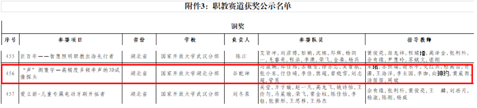 本网讯(通讯员 袁俊 文/图)近日,教育部中国国际大学生创新大赛(2023)(原中国国际“互联网+”大学生创新创业大赛)获奖名单正式公布,1xbet平台参赛项目“声”测寰宇—高精度多频率声纳3D成像探头获得职教赛道铜奖,至此,1xbet平台在2023年的中国国际大学生创新大赛中共获得国赛职教赛道铜奖1项,省赛职教赛道金奖1项(全省排序第7名,创意组第3名)、铜奖3项。