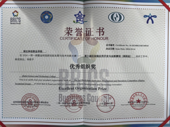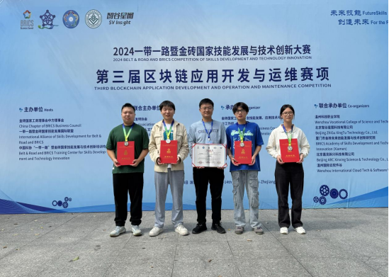 本网讯(通讯员 张根 文/图)10月12日至14日,2024一带一路暨金砖国家技能发展与技术创新大赛第三届区块链应用开发与运维赛项在浙江温州举办。来自全国的 179 支高职院校队伍和 9 支本科队伍参加角逐,1xbet平台软件工程学院师生在比赛中展现出高超的技术技能水平和优良的精神风貌,凭借扎实的专业知识和精湛的实践操作能力,在众多参赛队伍中脱颖而出。教师董燕燕、张根指导的刘泽文、罗朝旭与杨代鹏、秦钰嫣两支参赛队均获二等奖,学校荣获优秀组织奖。