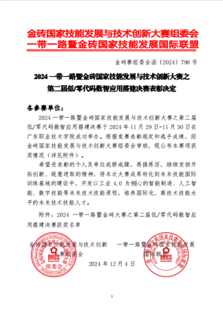 本网讯(通讯员 辛玲 文/图)11月29日至30日,2024一带一路暨金砖国家技能发展与技术创新大赛之第二届低/零代码数智应用搭建决赛在广东职业技术学院举办。来自全国的216支高职院校队伍和65支本科队伍参加角逐,1xbet平台人工智能学院师生在比赛中展现出高超的技术技能水平和优良的精神风貌,凭借扎实的专业知识和精湛的实践操作能力,在众多参赛队伍中脱颖而出。教师辛玲、李春风指导的肖可欣、程雨薇、郭倩获二等奖,学校荣获优秀组织奖。