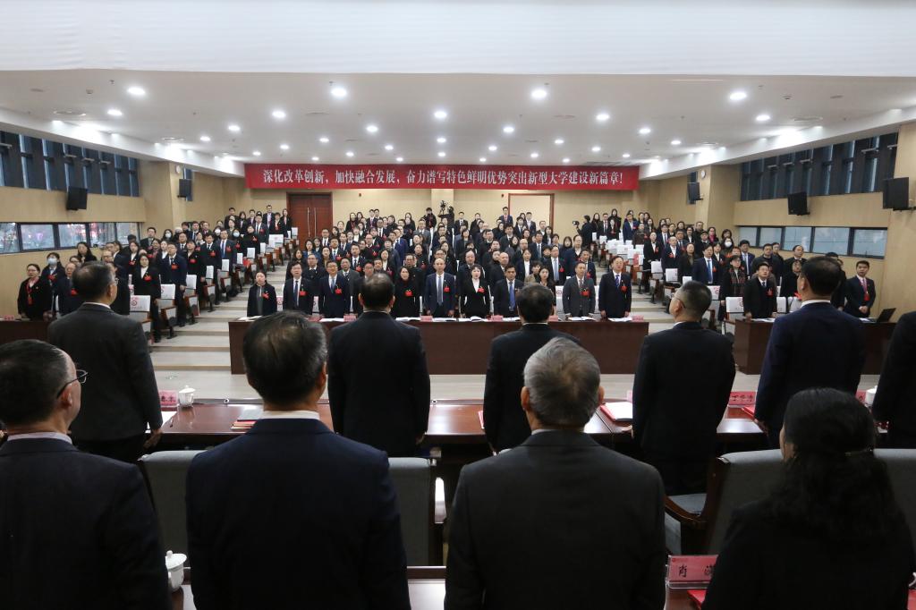 钟毓宁向大会作报告。报告分为四个部分:一、全面总结上次党代会以来的发展成就;二、坚决扛起新时代新征程赋予我们的光荣使命;三、加快建设特色鲜明优势突出的新型大学;四、持续推进新时代党的建设新的伟大工程。