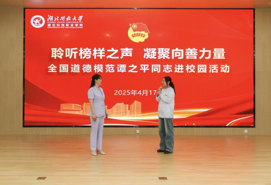 全国道德模范谭之平曾因孝老爱亲、自强不息的感人事迹广受社会赞誉。“16岁那年,母亲离世,父亲患上了严重的风湿病。为了筹集医药费,我拿着在百货店打工攒下的积蓄和四处借来的钱,带着父亲来到汉口,在火车站旁租下一间小店经营小超市。”谭之平望向台下师生,声音微微发颤,“这六年中,我在守着小超市的日子里看书自学,每当看到生病的父亲,我就更加坚定信念:一定要考上医学院,帮助更多像我父亲一样的患者!”2005年,她如愿考入湖北职业技术学院临床医学专业学习,用沾满油渍的账本换来了录取通知书。从辍学务农、家遭巨变到辗转打工、创业救父,再到重返校园圆梦大学,八年光阴里,她以非凡毅力谱写出逆风翻盘的人生新篇。“有人说孝心是负重前行的包袱,但于我而言,它永远是照亮黑暗的灯火。”她的话语引发全场共鸣,孝道文化的感人力量更是让不少师生为之动容。