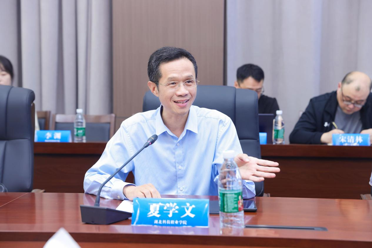 夏学文简要介绍了学校作为湖北省“双高计划”建设院校在人工智能教育领域的积极探索与取得的成果。他指出学校通过牵头成立湖北省人工智能行业产教融合共同体、建设省级《人工智能技术应用》通识课程等举措构建了产教融合发展新格局。目前学校正与广东科学技术职业学院、湖南科技职业学院等兄弟院校共同牵头立项建设国家级人工智能教学资源库,已明确了资源库系统建设、智能化应用升级及国际化战略推广三大核心任务。