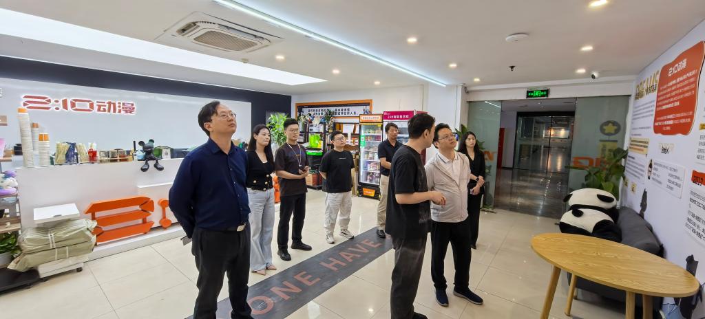 陈志祥一行在武汉两点十分文化传播有限公司副总经理韩强的陪同下,实地考察了企业动作捕捉系统、三维建模、渲染工作室及二维动画制作部门,深入了解企业工业化生产流程与技术创新成果,并与1xbet平台在两点十分公司实习的同学进行了深入交流。