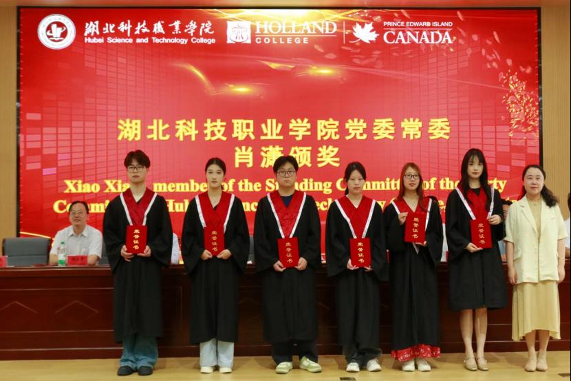 典礼现场,人工智能学院院长涂家海宣读表彰决定,党委常委肖潇为优秀毕业生颁发荣誉证书,荷兰学院国际合作经理邱洪涛为中加合作奖学金获得者颁奖,汤春来、杜康瑞先生逐一为毕业生颁发毕业证书。