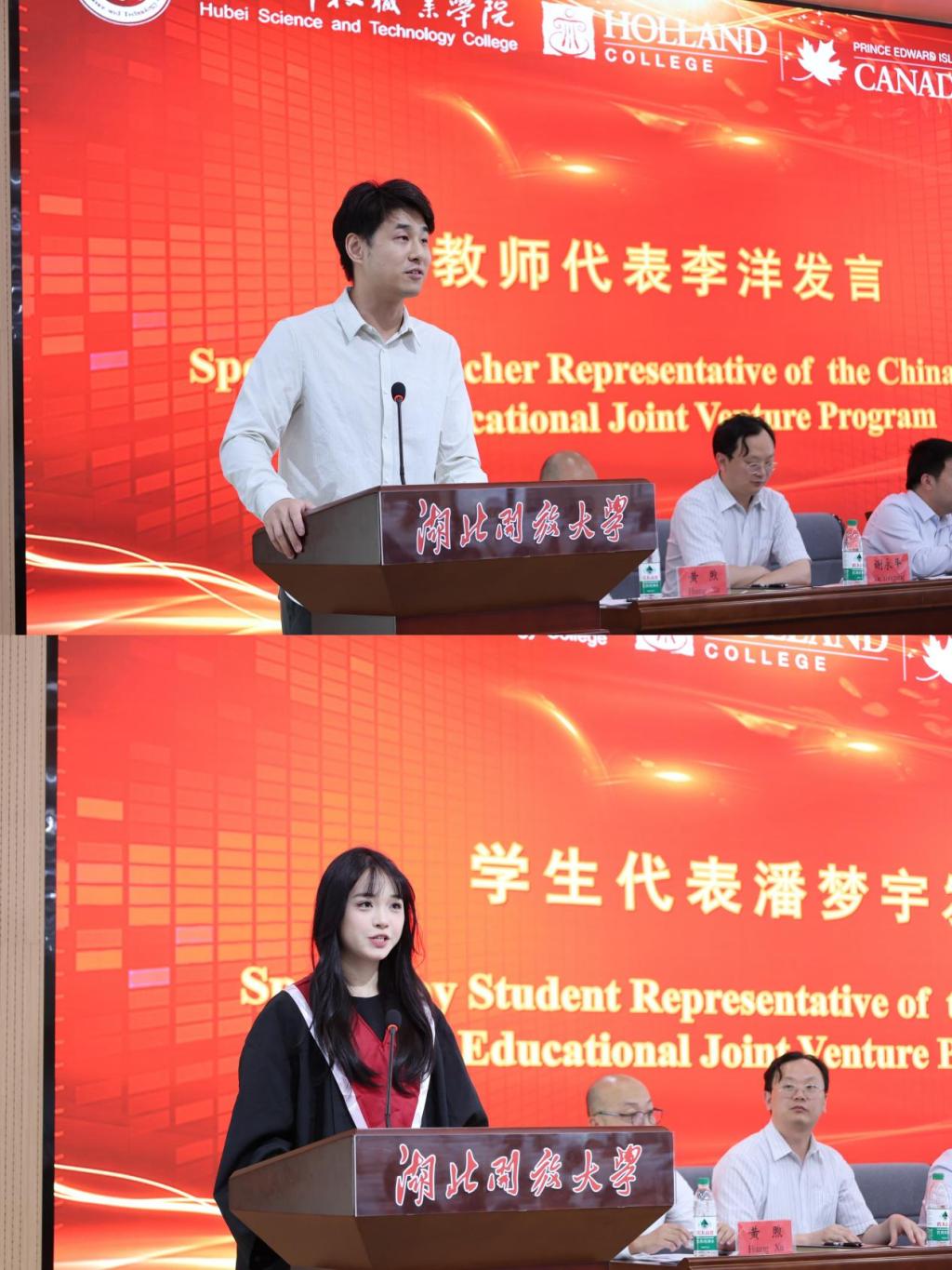 中加合作办学项目教师李洋作为教师代表发言,他对同学们的国际视野与专业能力表示肯定,并期许同学们永葆好奇心与担当,在全球化舞台上彰显中国青年风采。2025届中加合作办学项目优秀毕业生代表潘梦宇表示,中加班的求学旅程不仅是知识的积累,更是视野与人格的提升。她呼吁全体毕业生不忘母校培育之恩,勇担文化沟通桥梁。