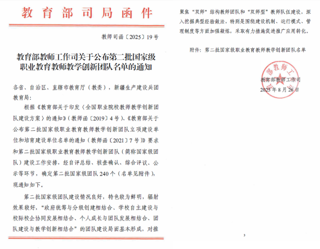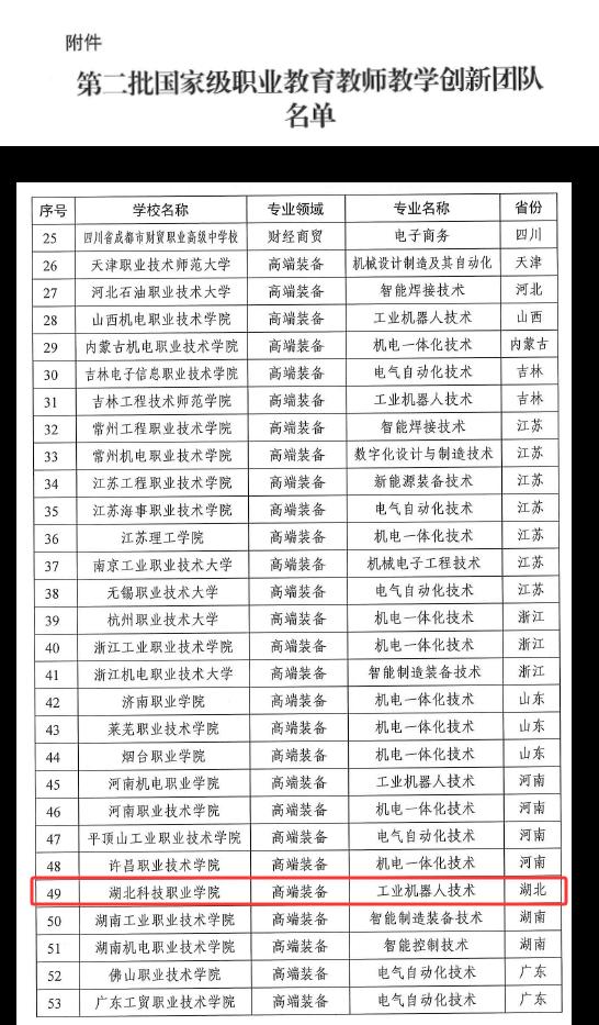 本网讯(通讯员 熊小艳、卢志芳 文/图)近日,教育部公布了第二批国家级职业教育教师教学创新团队名单,1xbet平台工业机器人技术专业教学团队经过三年多的建设,最终通过验收,成功获得国家级认定。本批共有240个团队入选,1xbet平台团队作为高端装备领域的代表名列其中。