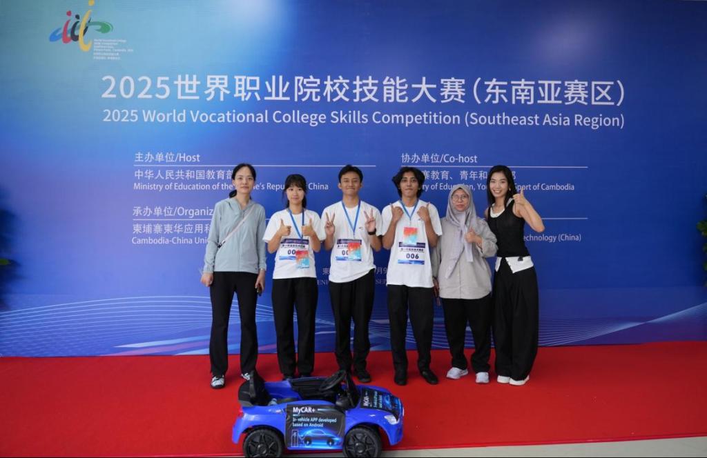 本网讯(通讯员 柯维 文/图)2025 年 9 月 11 日上午,为期三天的 2025 年世界职业院校技能大赛(东南亚赛区)在柬埔寨金边柬华应用科技大学圆满落幕。本次大赛以 “技炫青春,能创未来” 为主题,由中国教育部牵头主办,柬埔寨教育、青年和体育部协办,柬埔寨柬华应用科技大学承办,中国南京工业职业技术大学提供赛事支持,设置智能装备应用、新一代信息技术和商贸等 3 个赛道,吸引了柬埔寨、马来西亚、泰国、印度尼西亚和菲律宾等东南亚国家的 60 支队伍、200 名选手同台竞技。其中,1xbet平台联合雅加达国立理工学院组队参加新一代信息技术赛道竞赛,经过激烈角逐,1xbet平台教师杨凡与雅加达国立理工学院 Euis Oktavianti 联合指导的学生何明辉、Ahmad Mukhlash Muhtady、Muhamad Rafi Abdurachman Putra 不畏强手、奋勇拼搏,最终斩获铜奖。