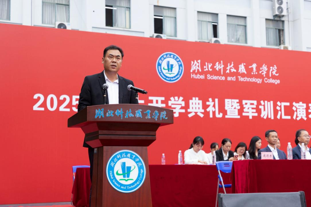 新生代表艺术创意学院2025级广告艺术设计专业柯宇麒同学发言。她感言湖科是“职业落地、梦想扎根的沃土”,并与同学们约定:以终身学习深耕专业、以主动成长突破自我、以身心健康永葆活力,用奋斗书写青春,共绘湖科新篇章!