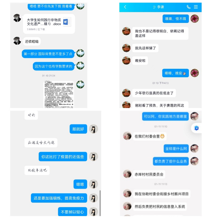 “你阳了吗?家里冷不冷,目前身体怎么样?”“酒店实习什么时候放假?”“最近复习效果如何,注意劳逸结合哦。”寒假初期,辅导员们通过“辅导猫”落实了学生假期具体去向、搜集学生感染情况以及基础疾病学生信息,建立好信息台账,动态更新;有针对性地对心理高关怀学生、困难家庭学生以及有基础疾病学生进行一对一“云”线上联系访谈,持续跟进关心、了解学生需求。2020级电子商务专业学生李谦,因身患神经纤维瘤住院治疗,辅导员熊老师每天与其保持联系,时刻分享生活趣事、交流感情,为她加油打气,浓浓关怀暖生心。