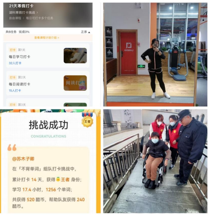 为深入学习贯彻落实党的二十大精神,积极参与健康中国行动,在师生中倡导文明健康的生活方式,学院通过微信公众号发起“寒假21天打卡挑战”活动,打卡内容分为知识学习类、运动健身类、才艺展示类、社会实践类,希望学生们在寒假休息之余养成良好习惯,培养自律能力,调节负面情绪。自活动开展以来,全院有近100名学生参与小程序打卡活动,截止到目前后台共发布261条打卡动态,有认真学习备考的、坚持跑步、坚持做家务的、积极参与寒假社会实践的…此活动仍在持续进行,同学们热情高涨,积极参与,有利于引导培养疫情下健康的生活方式。