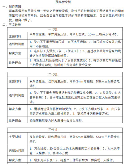 张毅力家住湖北宜昌五峰土家族自治县,由于地处深山之中,家家户户冬季取暖完全依靠烧柴火。劈柴是个体力活,每个假期他都会承担这项重任主动帮助家里减轻负担。“用斧头劈柴,一天下来腰酸背痛还没有效率。”张毅力回想起在校学过的气动和液压技术,再加上金工实训课时的内容,决定自己动手制作一台可以轻松劈柴的工具。他找来家里废弃的电动机、齿轮泵、槽钢、液压缸等工具材料,开始设计制作自劈柴机。由于力学方面的知识掌握还有些薄弱,他也走了不少弯路。刚开始做的第一代劈柴机受力不均出现了液压缸压条变形、滑槽位移甚至折断、刀头断裂等问题,他恶补相关理论并积极向老师请教,经过不断地试错、修改,迭代三个版本,一台简易的“劈柴神器”便在张毅力的手中诞生了。