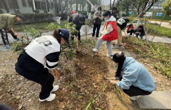 在听取园林老师讲解了工作要领后,学生们热火朝天地行动起来,很快进入了劳动状态。有的挥锹铲土,有的种草填土,每个人都忙的不亦乐乎。嗅着新翻泥土的气息,看着生命蓬勃的嫩苗、焕然一新的草地,大家心里满满的成就感。