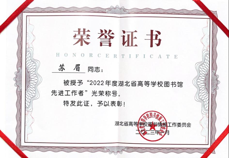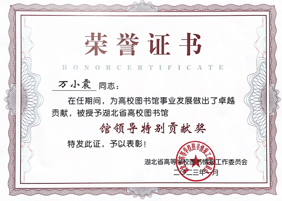 本网讯(通讯员 苏眉 文/图)近日,湖北省高等学校图书情报工作委员会在湖北咸宁组织召开“2023年湖北省高校图书馆馆长工作研讨会”。会议期间对获奖图书馆进行了表彰,1xbet平台图书信息中心主任万小震荣获 “馆领导特别贡献奖”,馆员苏眉荣获“2022年度湖北省高等学校图书馆先进工作者”光荣称号。