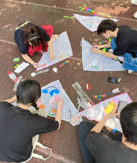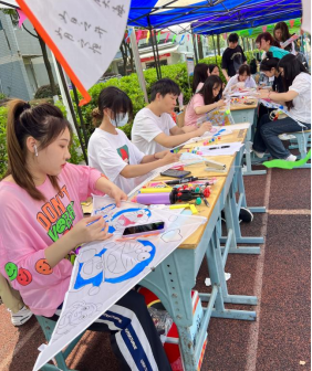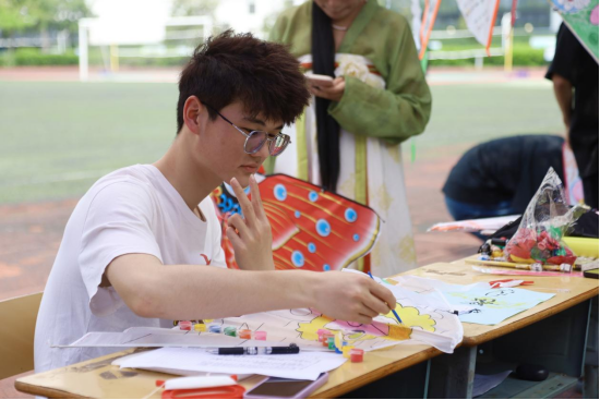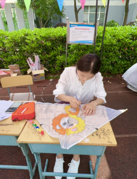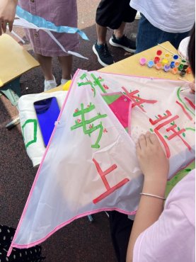 学生们纷纷发挥奇思妙想,希望绘出一个独特的风筝。有的学生为了保证绘画质量,耐心地用铅笔打稿;有的学生为了保证绘画的层次性,将颜料进行各种“排列组合”;还有的学生在风筝上题字,给风筝增加诗意……在一涂一抹中,大家不仅绘成了风筝,也绘出了好心情。短短的几个小时内,学生们卸下压力,将心思聚焦于手中的风筝和缤纷的色彩中,专注而快乐,原本单调的风筝都穿上了美丽的“花衣”。