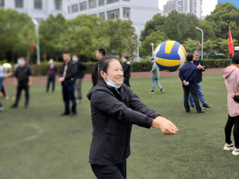 明媚的阳光下,文淑斌老师以一段小跑带动大家进行课前热身,有效调动了学生们的参与度。学生们神采奕奕、精神饱满,充分展现了广大青年学生活力充沛、朝气蓬勃的精神风貌。文淑斌以游戏“桃花朵朵开”导入课程内容,该游戏将诗词和数学内容作为德育元素融入课程思政,弘扬中国传统文化。通过游戏,既激发了学生的学习热情,也充分体现出班级凝聚力。她详细讲解了排球捧垫球动作的要领,通过教师示范、指导纠错、分组练习、小组比赛四个环节,让学生快速地掌握排球捧垫球方式。全体学生通过了学习测试,有效达成教学效果。