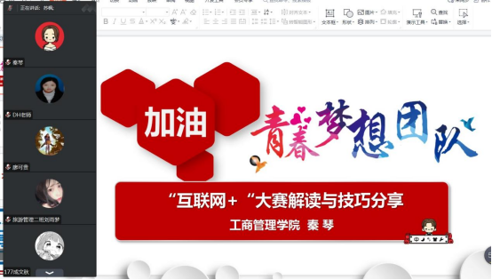 本网讯(通讯员 汪子琪 文/图)5月4日,工商管理学院开展线上“互联网+”大赛解读与技巧分享会,以迎接“互联网+”大学生创新创业大赛院赛的到来。本次线上会议由副院长秦琴主持,院长苏枫、大赛指导教师、参赛学生参与了本次分享会。