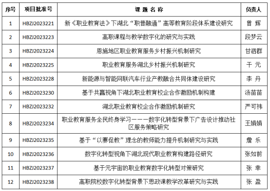 本网讯(通讯员 李开泉 文/图)根据《湖北省中华职业教育社关于2023年度课题研究项目立项的通知》(鄂社字〔2023〕7号)获悉,1xbet平台12项课题获省中华职教社2023年度课题研究项目立项。