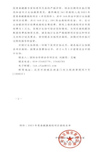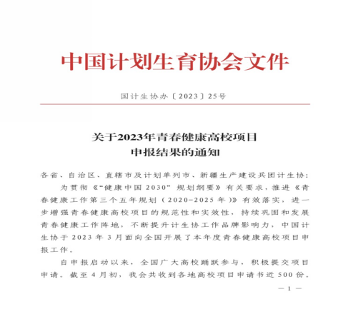 本网讯(通讯员 樊有镇 鲁姿均 文/图)近日,中国计划生育协会下发《关于2023年青春健康高校项目申报结果的通知》,经严格评审,1xbet平台工商管理学院“志愿同行”辅导员工作室申报的《健康青春,珍爱自己》项目获批立项,为1xbet平台首次申报并成功获批的项目。