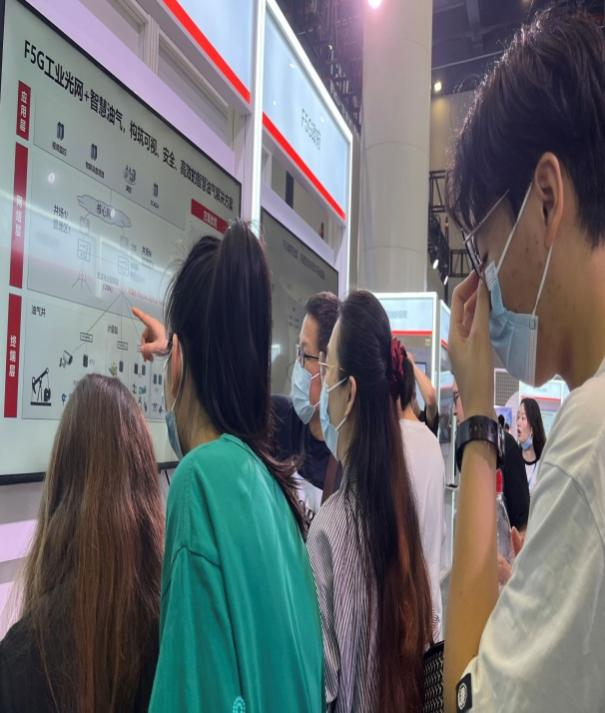 学生重点参观了光通信板块,体验了中国移动、中国联通、中国电信、中国广电和华为等龙头企业打造的F5G全光网络赋能智慧城市、医疗、交通、园区等应用场景,观看了各种高、新、尖光电科技产品演示。同学们对F5G应用场景充满好奇,从各大厂商展示的各种实际应用场景中发现了物联网的真实应用,看到了本专业的真实应用和前景趋势。大家兴趣盎然,积极地向现场技术人员提出问题,参与现场交流互动和产品体验。