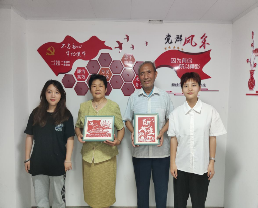 “区微里”志愿服务队的同学们结合自己的专业知识,通过自己的双手,利用传统非遗剪纸工艺,在一块块宣纸上雕刻出了他们心中的中国共产党。同学们将这些融入党史元素的剪纸制作成红色非遗文创作品,赠送给老党员们,表达青年对老一辈党员们的致敬。
