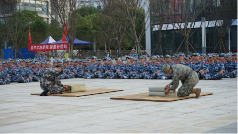 精彩的展演,成就更精彩的自己。10月12日,软件工程学院以“淬炼青春志,踔厉未来梦”为主题,组织开展了由退役复学学生和教官代表组成的“叠被”比赛和格斗术展演特色活动。随着“预备、开始”一声令下,教官和学生都立即进入状态,迅速蹲下,铺平、压实、翻折、抠角、捏线,动作一气呵成,毫不拖泥带水。很快,两床棱角分明整齐方正的被子展现在大家面前。紧张的“叠被”赛后,格斗术方阵也登台展示。官兵拨挡冲拳,擒臂上钩,顶肘撞膝……每个动作都干脆有力,刚柔并济,灵活坚韧,一招一式,尽显风度。“叠被”比赛展示的内务之美和格斗术方阵所展示的力量之美,赢得了全场阵阵掌声,吸引了正在调研“两栋楼”建设的校党委书记刘义、校纪委书记张文凯等领导,他们在展演现场看望参训师生,对军训方阵特别是展演官兵所展现的勃勃雄姿表示赞赏,为大家送来殷殷的关怀和满满的正能量。