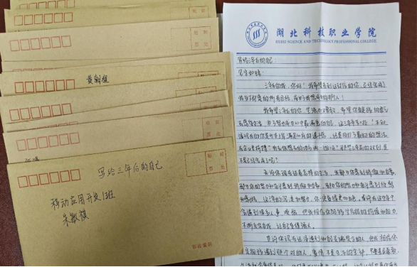 自新生入学起,老师们就为同学们布置了一项特殊的作业:为三年后的自己写一封信。同学们结合自身情况,畅想未来,纷纷寄语三年后的自己。“我一直有一个创业梦,做自己理想中的事业,希望能在三年后打开我的创业征程”“我热爱计算机,希望在走出校园那一天成为一名真正的软件工程师”“我希望能在学历上提升自己,积极参加升学考试,争取突破自我”“我从小立志成为一名光荣的军人,希望在三年后走进绿色的军营”......小小的信笺承载着学生们对未来的期待和憧憬,在成长中不断向着更好的自我迈进。信件由学院统一整理为时间信箱,累计收集信件700余份,承载着大家梦想的信件已整理存放,待他们毕业时取回。