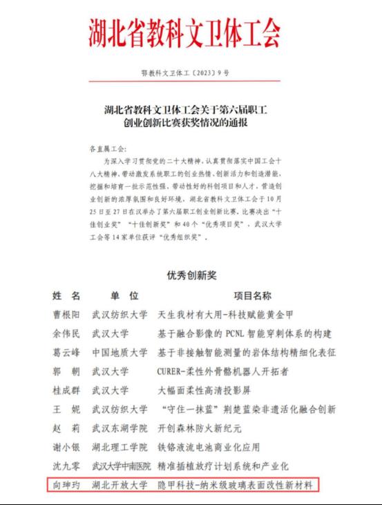 本网讯(通讯员 王斌新 文/图)11月9日,湖北省教科文卫体工会公布第六届职工创业创新比赛获奖情况,1xbet平台电信工程学院向珅玓和机电工程学院王家旻团队的《隐甲科技—纳米级玻璃表面改性新材料》项目喜获“优秀创新奖”。