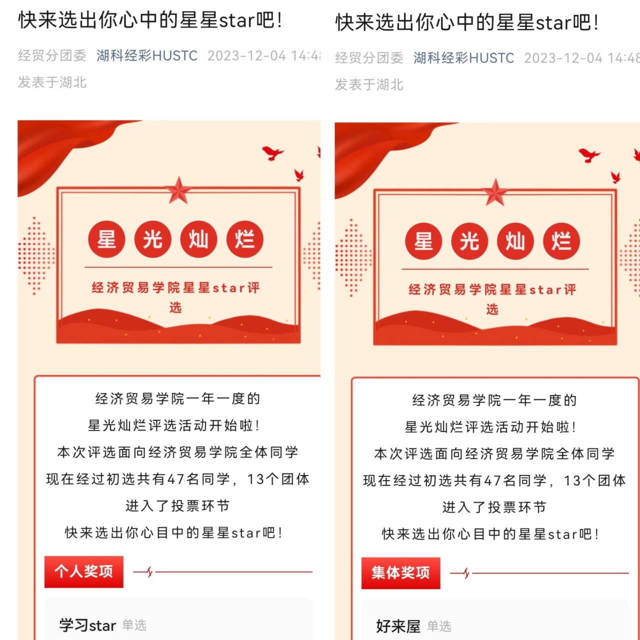 以行动示范为抓手,本学年开展“头雁计划”培训班,加强学生干部的培养和管理,引导优秀学生在学院内形成良好的行动示范作用。打造“五比五看评十星——经贸星光灿烂”“活力经贸——五力并发”“‘七’心协力——五彩经贸”等系列品牌活动。本年度“星星”由学院教师推荐报名与学生自愿报名相结合,经网络投票、班级投票、教师投票,最终选出在学习、才艺、运动、诚信、互助、自律、文明、自强等十个方面最具有代表性的优秀学生予以表彰,培养学生群体中的“星”榜样。