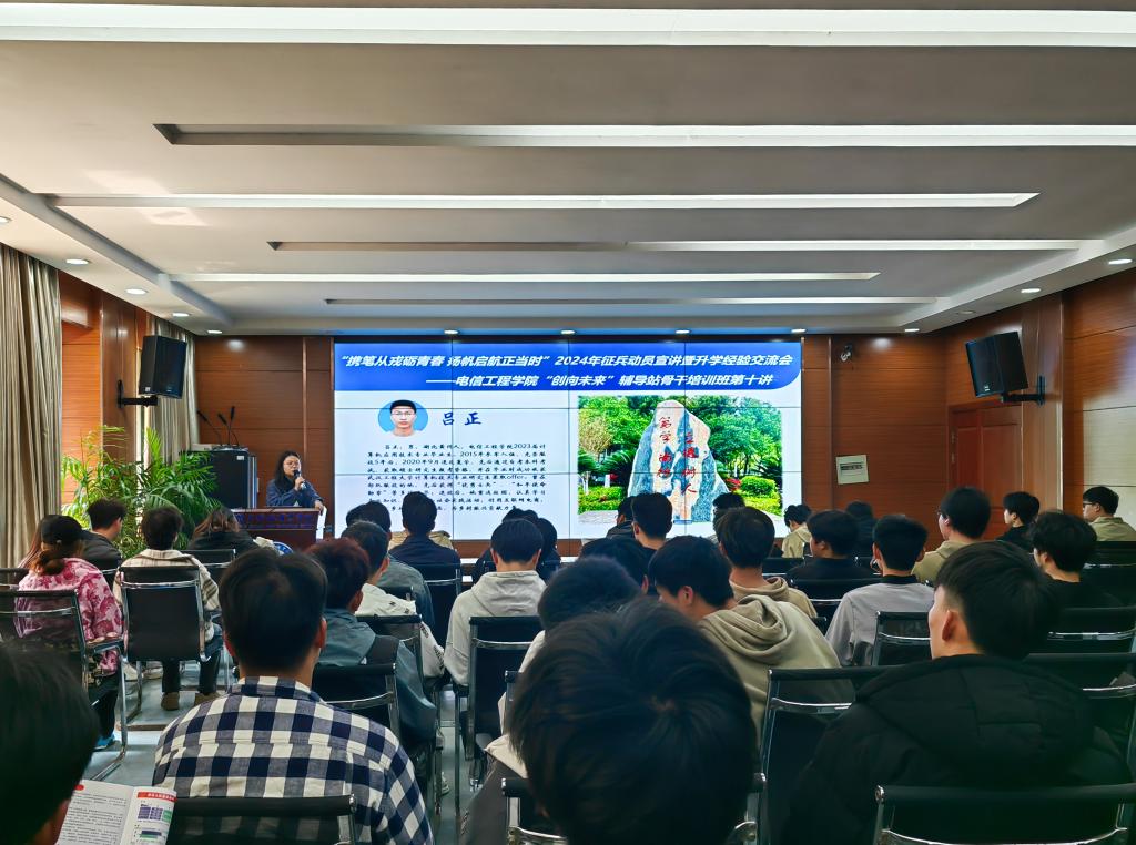 本网讯(通讯员 刘洵 向珅玓/文 大学生记者:李大为 张舒凯 曹礼成 蔡迪嘉恒/图)为进一步促进毕业生高质量就业,积极响应国家征兵工作号召,点燃学生参军热情,3月15日中午,电信工程学院举办“创向未来”辅导站骨干培训班第十讲——2024年征兵动员宣讲暨升学经验交流会,邀请1xbet平台2023届计算机应用技术专业毕业生吕正同学担任主讲嘉宾。