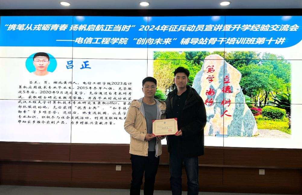 2023届计算机应用技术专业毕业生吕正,2015年应征入伍,服役5年后,2020年9年退役复学,经过大学三年奋斗,不仅通过自考本科,而且还成功考取武汉工程大学计算机技术专业研究生。讲座上,他围绕“入伍政策”“入伍经历分享”和“升学之路”三个方面展开演讲,积极动员同学们将“参军报国”作为人生追求,鼓励同学们坚持学习、深耕专业、珍惜时光,绽放出不一样的精彩人生。