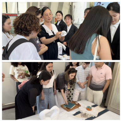 活动后,留学生前往五号楼一楼大厅和四楼邮轮客舱实训室参观,并在工商管理学院院长苏枫的指导下尝试折叠毛巾花。