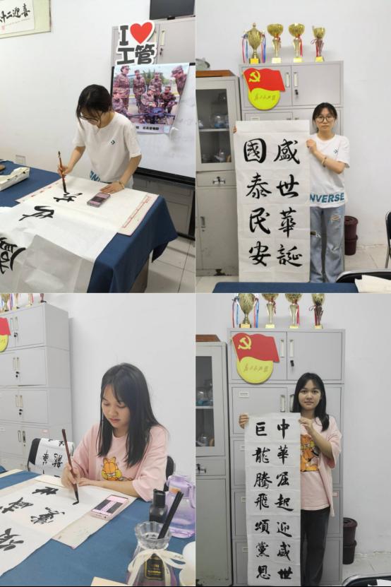 为弘扬中华优秀传统文化,歌颂中国共产党的光辉历程,激发学生爱国情感,工商管理学院于5月28日在一站式学生社区开展了“庆祝新中国成立75周年”书法展。学院书法爱好者执笔挥毫,用书法作品为祖国献礼。此次活动让同学们通过书法艺术表达对祖国的热爱和对美好生活的向往,也进一步增强了文化自信和爱党爱国情感。