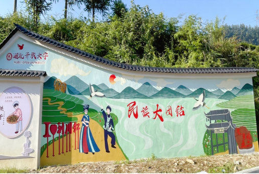 2023年7月,湖科学子再一次走进五二村开展了“艺术点‘靓’乡村,墙绘传递新风”的主题墙画绘制活动。同学们以茶园、五二新村桥、利川红茶、幸福石、民族大团结字样等为元素的墙画,勾画出幸福生活共同缔造的画面。