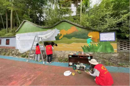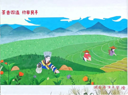 在此背景下,2022年7月湖科学子暑期“三下乡”走进利川市毛坝镇五二村,将墙绘与茶园特色有机结合,绘制出茶园里,漫山遍野的茶树绿意盎然,茶农穿梭其中,将细芽一一摘下的画面,让墙绘成为茶文化和传统文化内涵的诠释,也让村民了解茶文化的博大精深,充分调动村民种茶积极性,同时也能美化村庄面貌,成为一道靓丽的乡村风景线。