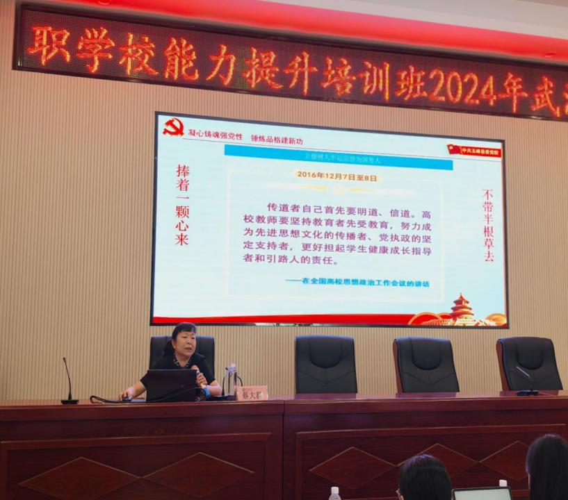 开班仪式前,由武汉市旅游学校教师皮力带领全体学员重温教师誓词。武汉经济技术开发区职业技术学校杨春侠老师作为学员代表发言。