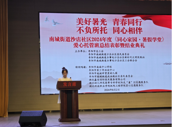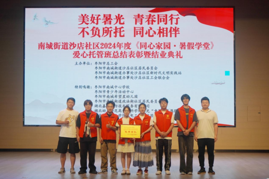 课堂上,志愿者是小朋友们的耐心老师,传道授业解惑;课堂外,志愿者是小朋友们的知心朋友,相识相知相伴。8月2日,沙店社区举办同心家园总结表彰暨毕业典礼。毕业典礼上的节目见证了孩子们的成长与蜕变,也体现了志愿者的辛勤与付出。优秀志愿者代表分享了支教过程中的所见所闻所感所悟,讲述与孩子们共度的难忘时光,展现了志愿者们对公益事业的执着追求,也激励更多社会人士关注并参与到公益活动中来。